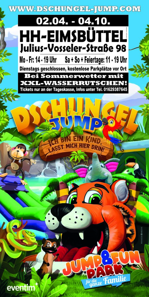 Dschungel Jump: Das ultimative Outdoor-Abenteuer! Tauche ein in eine grüne Wildnis voller Action: Von kleinen Hüpfburgen für die Jüngsten bis hin zu gigantischen Hindernisparcours im Tiger- und Palmen-Look ist alles dabei. Meistere die Kletterwände und rase die spektakuläre XXL Wasserrutsche hinunter! Action & Splash: Grenzenloser Spaß auf riesigen Dschungel-Anlagen und im kühlen Nass. Chill-Area: Entspanne in Sonnenliegen unter großen Sonnenschirmen, während die Entdecker toben. Stärkung: Genieße am Imbiss knusprige Pommes, kalte Drinks und erfrischendes Eis. Pack die Badehose ein und erlebe einen unvergesslichen Tag! „Mama, Papa – ich bin ein Kind, lasst mich hier drin!“